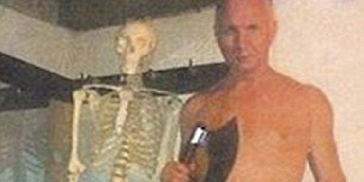 The snapshot shows Detlev Guenzel, a German cannibal killer, holding a large axe as he stands alongside a skeleton wearing nothing but his socks, a pair of sandals and a creepy smirk.