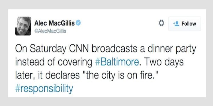 On Saturday CNN broadcasts a dinner party instead of covering #Baltimore. Two days later, it declares "the city is on fire." #responsibility — Alec MacGillis (@AlecMacGillis) April 27, 2015