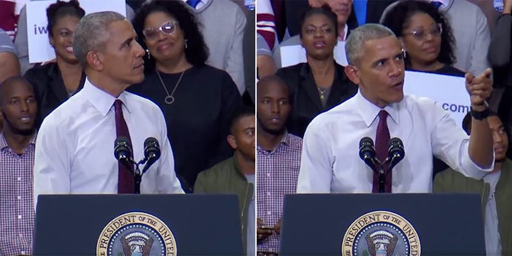 While Obama was making the case that Donald Trump is "unfit" to be president, the crowd turned its attention to a Trump supporter who stood up in the middle of the speech.