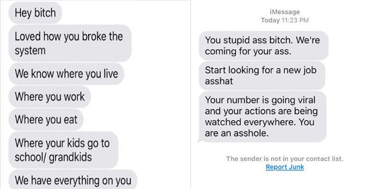 Lange received texts threatening her and her family. They allegedly called her a "stupid ass bitch," "assh*le" and "CUNT."