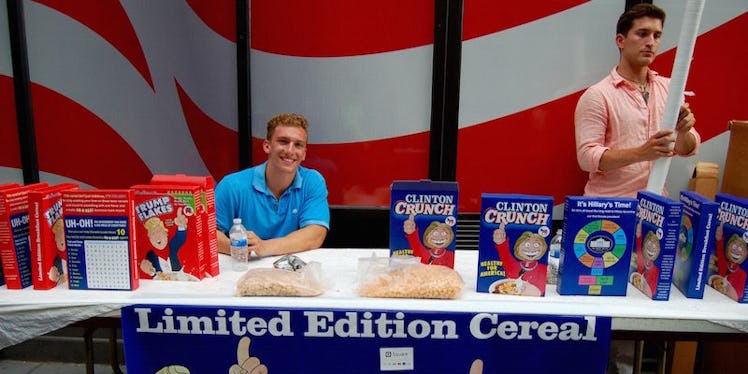 Malafronte and his friends personally made 1,000 boxes of "Trump Flakes" and "Clinton Crunch." The boxes look like real cereal, but have funny political twists. The Trump cereal, for instance, says on the back,