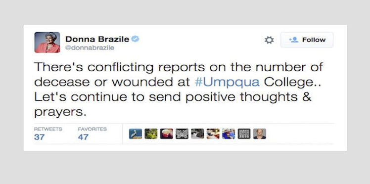 There's conflicting reports on the number of decease or wounded at #Umpqua College.. Let's continue to send positive thoughts & prayers. — Donna Brazile (@donnabrazile) October 1, 2015
