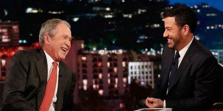 Bush reminds Kimmel he made quite a memorable (and meme-able) impression at Trump's inauguration while trying to put on a poncho.