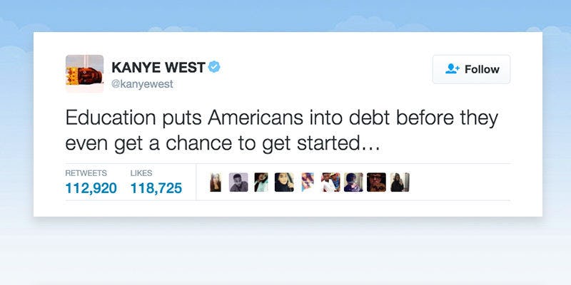 In a momentous occasion, Kanye West kicked off his 2020 presidential campaign on Tuesday afternoon, tweeting about the high cost of education.