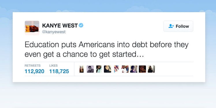 In terms of Kanye, this was a relatively tame string of tweets, and he's actually not wrong on this. The price of college textbooks rose by 1,041 percent since 1977, which was more than three times higher than the rate of inflation, according to NBC News.