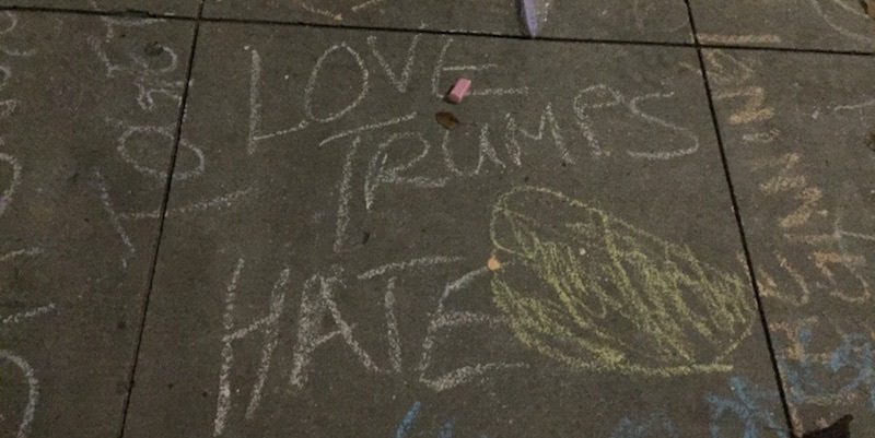 Kids of all ages joined their families and wrote hopeful notes, saying things like "Love Trumps Hate" and "Black Lives Matter," surrounded by scribbled hearts of all colors and sizes.