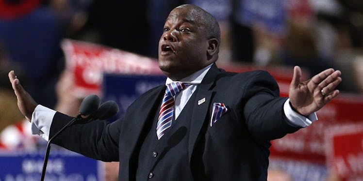 Pastor and Trump surrogate Mark Burns posted and vehemently defended a tweet that showed Hillary Clinton "pandering" to African-American voters in blackface on Monday.