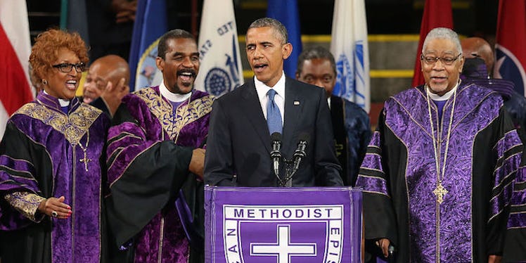Finally, Keenan reaches the end of this historical period in time: the famous eulogy Obama made for the victims of the Charleston shooting.