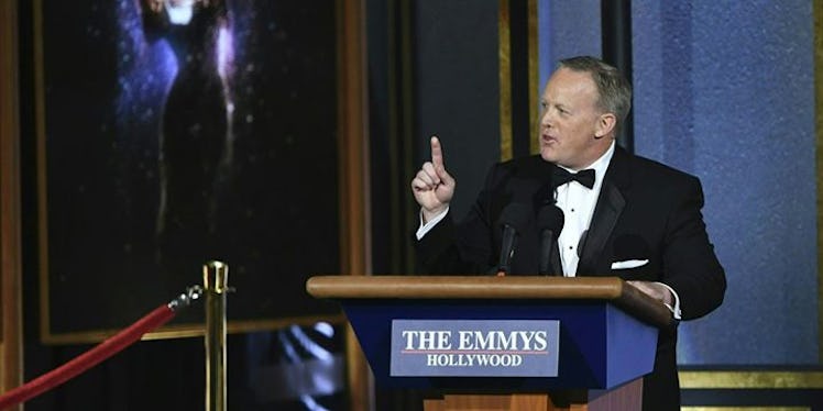 Spicer's interview with the Times came on Monday morning, Sept. 18, just a day after the former press secretary made a previously unannounced appearance at Sunday's Emmy Awards ceremony, where he satirized his infamous inauguration crowd-size comments. Spicer told the audience at the awards,