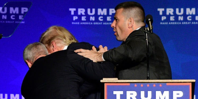 Suddenly, he's cut off by a ruckus at the front of the audience. Trump shields his eyes from the lights so he can see what's going on before his detail swoops in, bend his head down and rush him off stage.