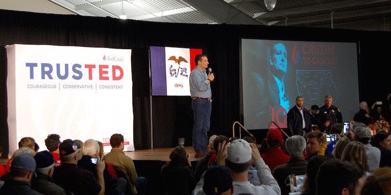 Republican presidential candidate Ted Cruz held a rally in Des Moines, Iowa on Sunday, the night before the Iowa caucus.