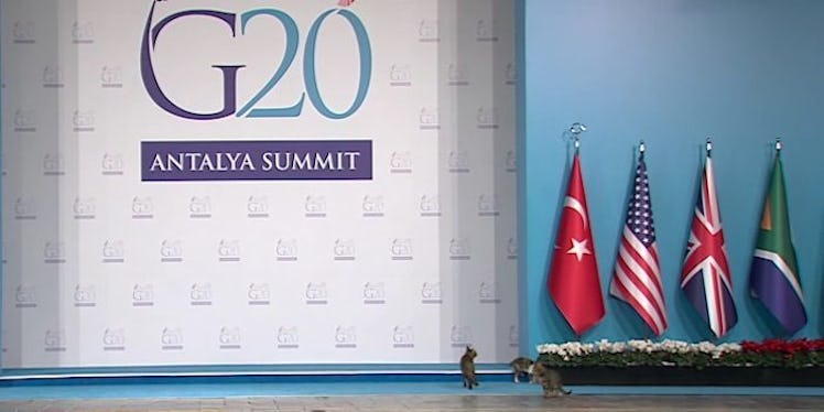 Three cats briefly took over the G-20 summit this weekend, brazenly walking on the same stage as world leaders -- including Barack Obama and Vladimir Putin -- in Antalya, Turkey.