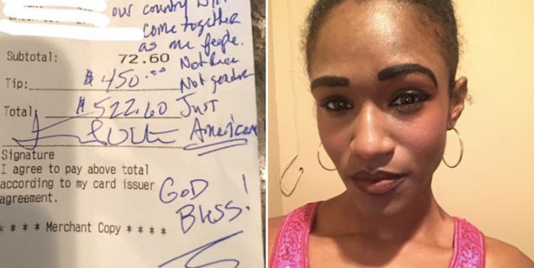 Citations: Customer leaves generous tip, message of unity at DC restaurant (WUSA9), A white Trump voter explains why he left a black waitress a $450 tip with an uplifting note (Washington Post)