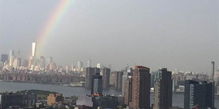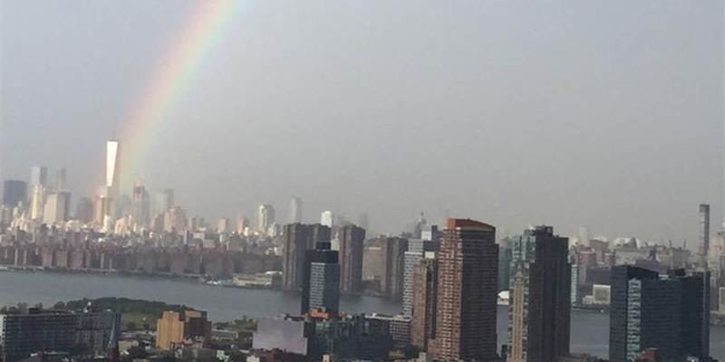 According to NBC News, Ben Sturner was on the balcony of his Long Island City residence yesterday when he photographed a rainbow that seemed to literally sprout out of the Freedom Tower.