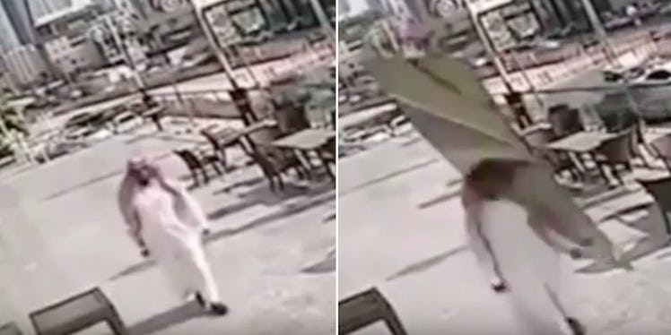 Surveillance footage captured in Saudi Arabia appears to show a man just barely avoiding being sliced open by a falling pane of glass.