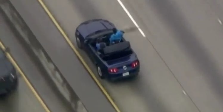 A police helicopter spotted the car in a matter of minutes, but Los Angeles Police Department officers reportedly waited a little while to pursue the suspects due to the wet roads and speed of the Mustang, which they believed would have only increased the danger for the public.