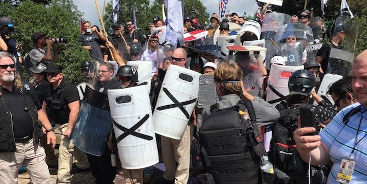 Everybody got maced. Legit, everybody got maced. When things got too aggressive, when people decided to throw too many water bottles from the other side, the white supremacists would periodically spray bear mace into the crowd. It wasn't the police; it was the white supremacists spraying bear mace into protesters' faces.