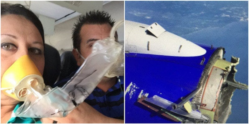 Stephanie, one of the 99 passengers on board, took a photo of herself with a man wearing oxygen masks that had dropped as the plane prepared to make an emergency landing.