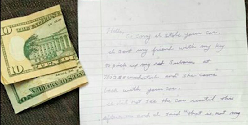 It's safe to say this woman is the sweetest car thief EVER. She even left gas money to make up for her friend's mistake.