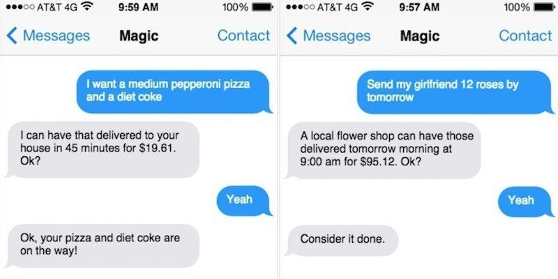Users begin by texting the company's main number, sending the word "Magic." An operator responds, asking what you need.