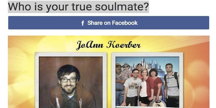 The "soulmate quiz" is like the Myspace quiz of years past, but a lot more stupid. The program analyzes your Facebook activity to determine who your true "soulmate" is, and then posts the results on your timeline for all to see.
