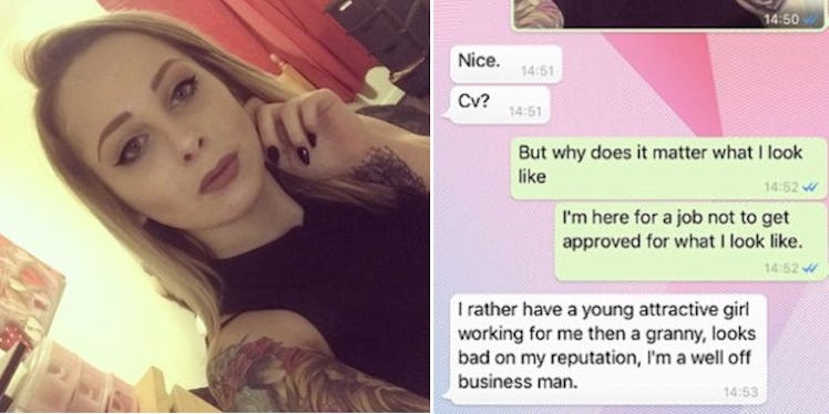 I have just finished college and I'm looking for work at the moment to decided to earn some money as a cleaner. A lawyer messaged me with a job opportunity clearing his house but then he asked me to send him pictures of myself. Then the conversation starting getting sexual and he said things like, "You look hot in that dress." He was a creep and not a nice guy. I've now blocked him. I was just trying to get a job and I was being discriminated against for my looks. It made me feel really little.