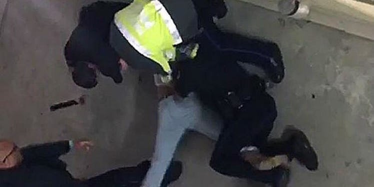 Outside, several policemen drag people out of the apartment, and one cop attacks a student with a stun gun and a baton.