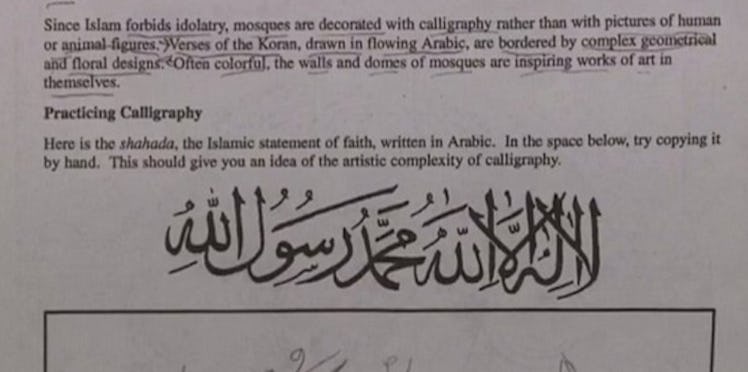 No lesson was designed to promote a religious viewpoint or change any student's religious belief. Although students will continue to learn about world religions as required ... a different, non-religious sample of Arabic calligraphy will be used in the future.