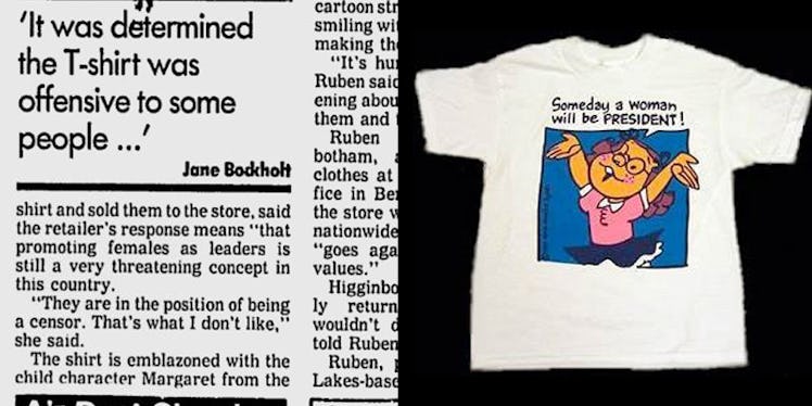 The woman who actually designed the shirt, a 70-year-old psychologist named Ann Moliver Ruben, said, “Promoting females as leaders is still a very threatening concept in this country.”