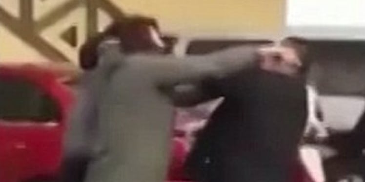 The video begins in a parking lot as a woman in green (the man's wife) begins swinging at the man for allegedly cheating on her with his daughter-in-law, who is wearing a white jacket.