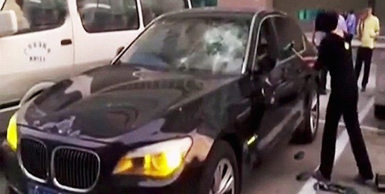 One woman in China is setting the scorned-lover bar pretty high after being caught absolutely demolishing her cheating husband's BMW 740.