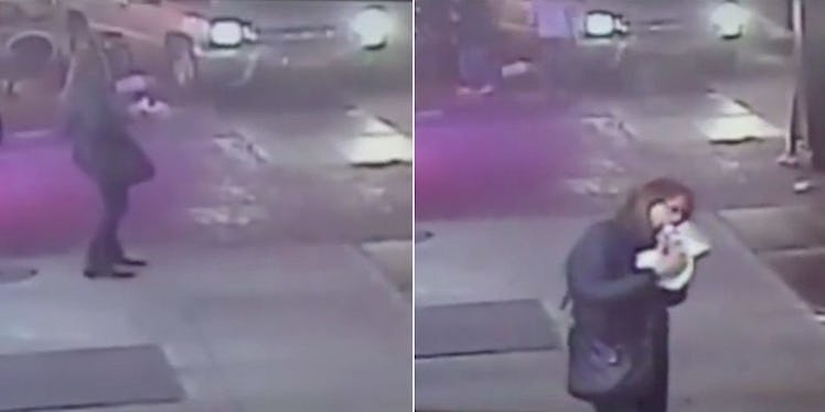 Surveillance footage shows what appears to be a middle-aged white woman walking down the street with a slice of pizza just before the car appears right behind her.