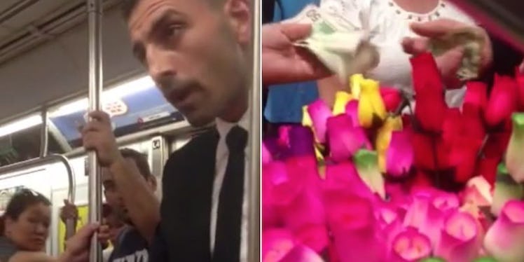 Struggling through her happy tears, the woman offers her multicolored roses to her fellow commuters. It's a beautiful reminder that making someone else's day can be very easy indeed.