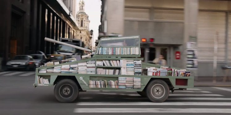 The car, filled to the brim with all kinds of books, is part of an ongoing art piece called "Weapons of Mass Instruction" (Arma de Instruccion Masiva).