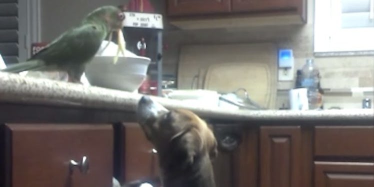 Bird Feeds Adorable Dog Friend By Dropping Spaghetti Into Its Mouth (Video)