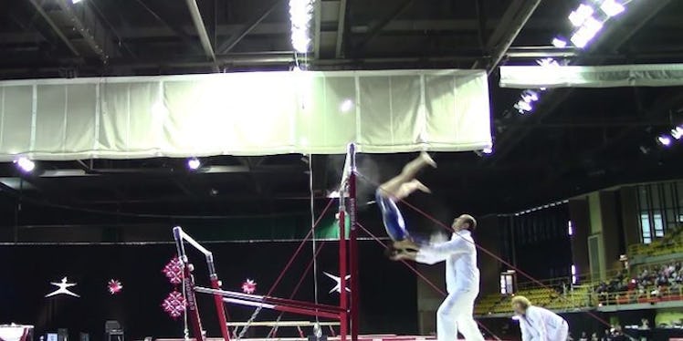 A young gymnast struggling with her routine owes her life – and spine, probably – to her coach.