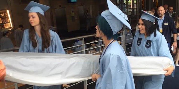 Emma Sulkowicz carrying her mattress across the stage at #ColumbiaCommencement pic.twitter.com/oF9sYwVYKX — Tess Koman (@tessie_the_mess) May 19, 2015