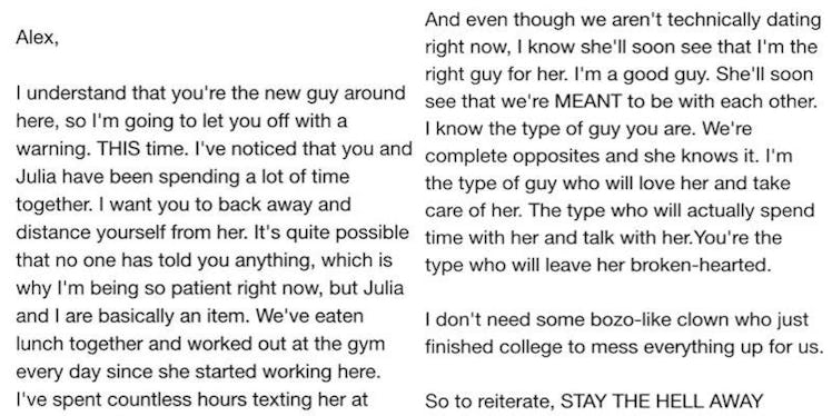 And so, in proper psychopath fashion, he sent the new guy an email warning him to back the f*ck off from his girlfriend stalking victim.