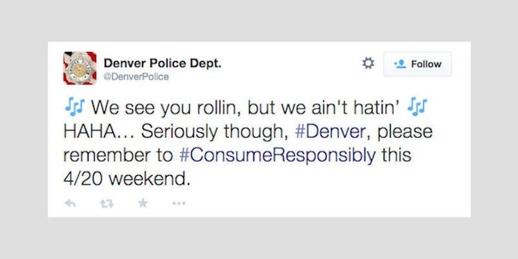 We see you rollin, but we ain't hatin' HAHA… Seriously though, #Denver, please remember to #ConsumeResponsibly this 4/20 weekend. — Denver Police Dept. (@DenverPolice) April 19, 2015