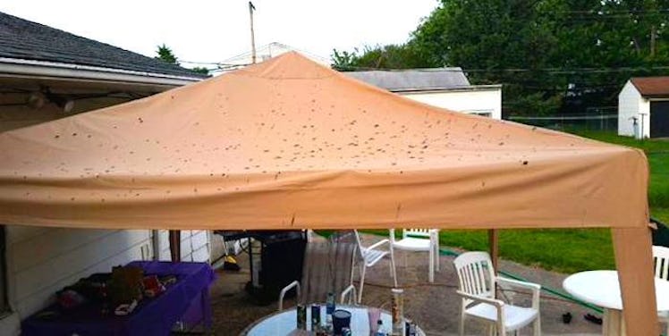 It landed on the baby seat that was here. We just got done with cake. Thank God. We took the cake back in, because within two minutes, something fell from the sky. It was brown, it was everywhere, it got on everything. I grabbed a hose from over here, immediately started lining things up to start washing it off.