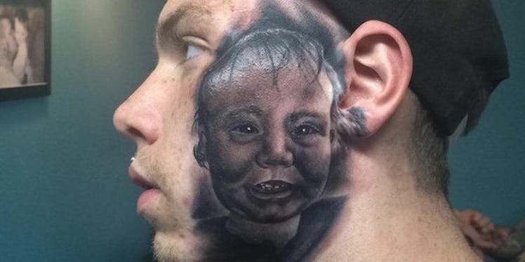 Looks like Christien Sechrist never got the memo because the 20-year-old did just that last July. He got a massive black-and-grey portrait of his son's face on his cheek.