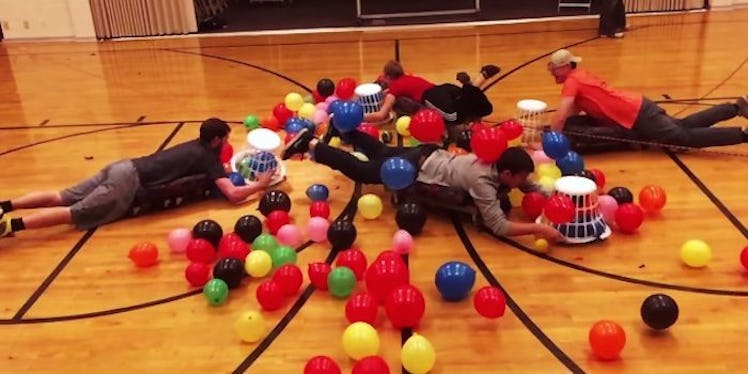 You'll need to find a big, empty space capable of housing each player, a crap-ton of balloons and one wheelie tray, bucket and bungee cord per player.