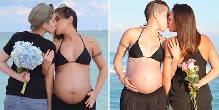 It consisted of two side-by-side photos. The first was taken in 2014, when her partner Vanessa Iris Roy was pregnant with their son, Jax. The second, taken exactly a year later, is from when she was pregnant with their daughter, Ero -- this one, a mirror image of the original photo.