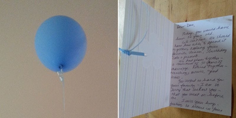 A blue balloon carrying a message of loss and love found its way into the hands of a very compassionate Imgurian.