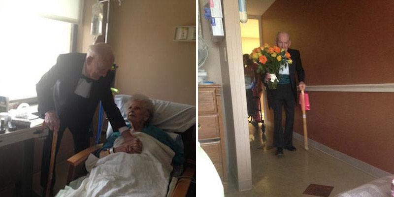 So, he put on a tuxedo and walked into her hospital room with chocolates and a bouquet of flowers.
