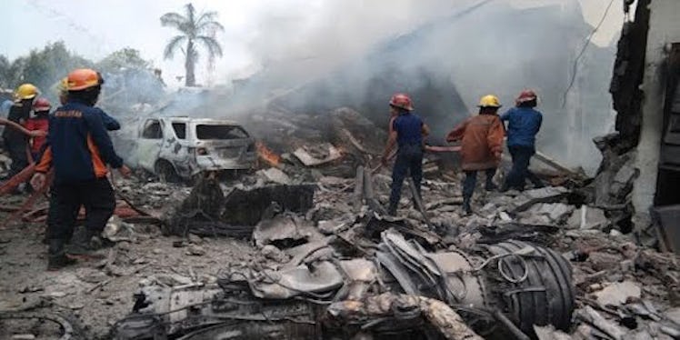 According to Coconuts Jakarta, officials said the plane, a Hercules C-130, went down on the island of Sumatra shortly after takeoff, ripping through buildings and leaving cars in ruins.