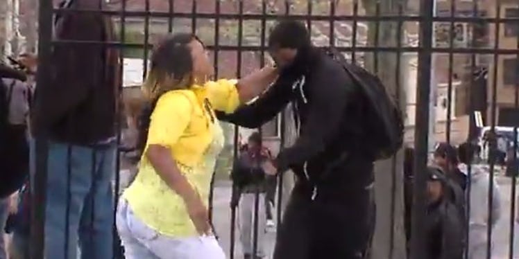 A video published by local Baltimore station WMAR shows a loud mother striding into a crowd in search of her teenage son, before pulling him away from fellow protestors. She grabs his sweatshirt and slaps his face repeatedly.