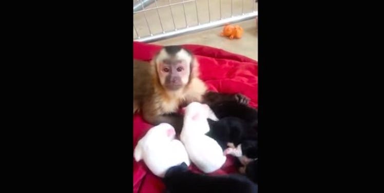 The 55-second-long video features a baby monkey playing with a litter of newborn puppies. Not just one puppy -- like, 10 puppies.