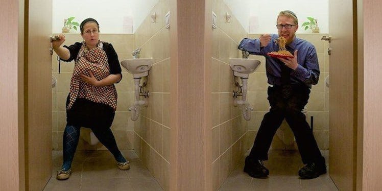 On one side of the photograph, a mother breastfeeds in a bathroom stall; on the other side, a man eats a plate of spaghetti in an identical stall. Both look extremely uncomfortable.