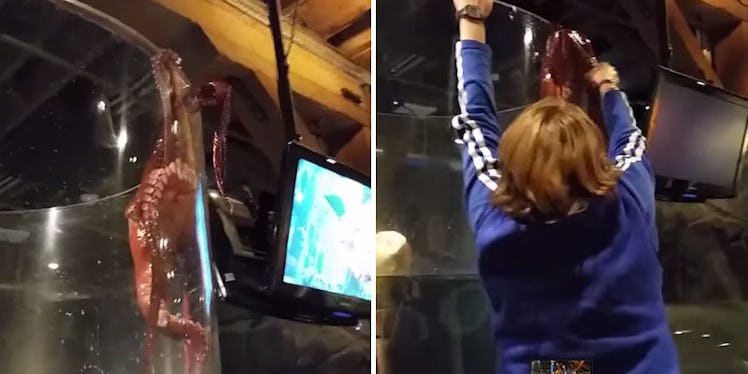 Tired of being gawked at by ignorant humans, an octopus attempted to escape from its enclosure and would have succeeded if it weren't for one brave staff member, who slipped its tentacles back inside the tank.